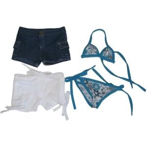 Four piece bathing suit set. Includes a blue paisley bikini and two pairs of shorts - blue denim and white cotton. Perfect for a day at the beach.